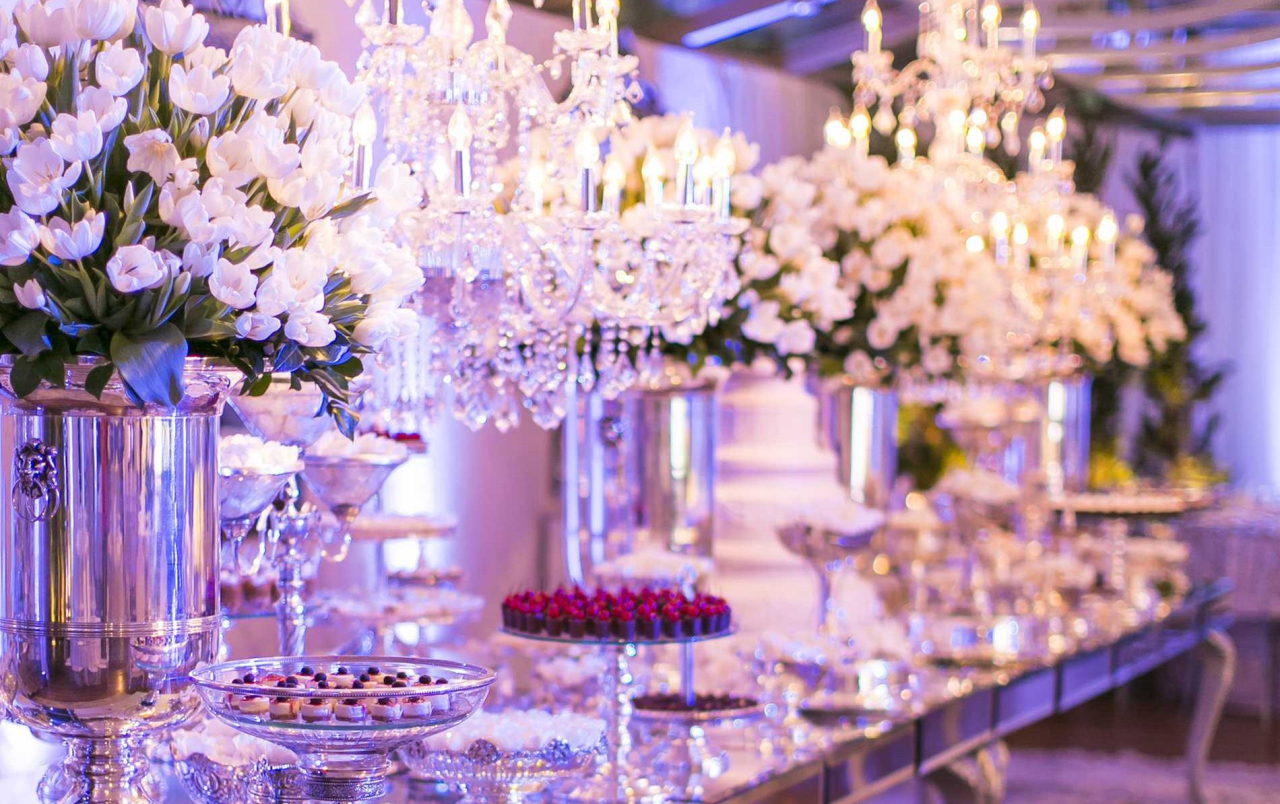 A linha contemporânea mais procurada são de móveis revestidos em espelho, no estilo Bisotê, liso ou Veneziano, diz Cristiane Chantal, da Cris Chantal Locação de Móveis para Eventos. A linha clássica sempre pede móveis vintage, em um estilo que vai desde o europeu como os itens no estilo Luís XV com peças em dourado, talhadas em madeira e com pés torneados; até o egípcio com estampas florais e detalhes dourados. As cores que predominam nos mobiliários são os tons de fendi, dourado e prateado.