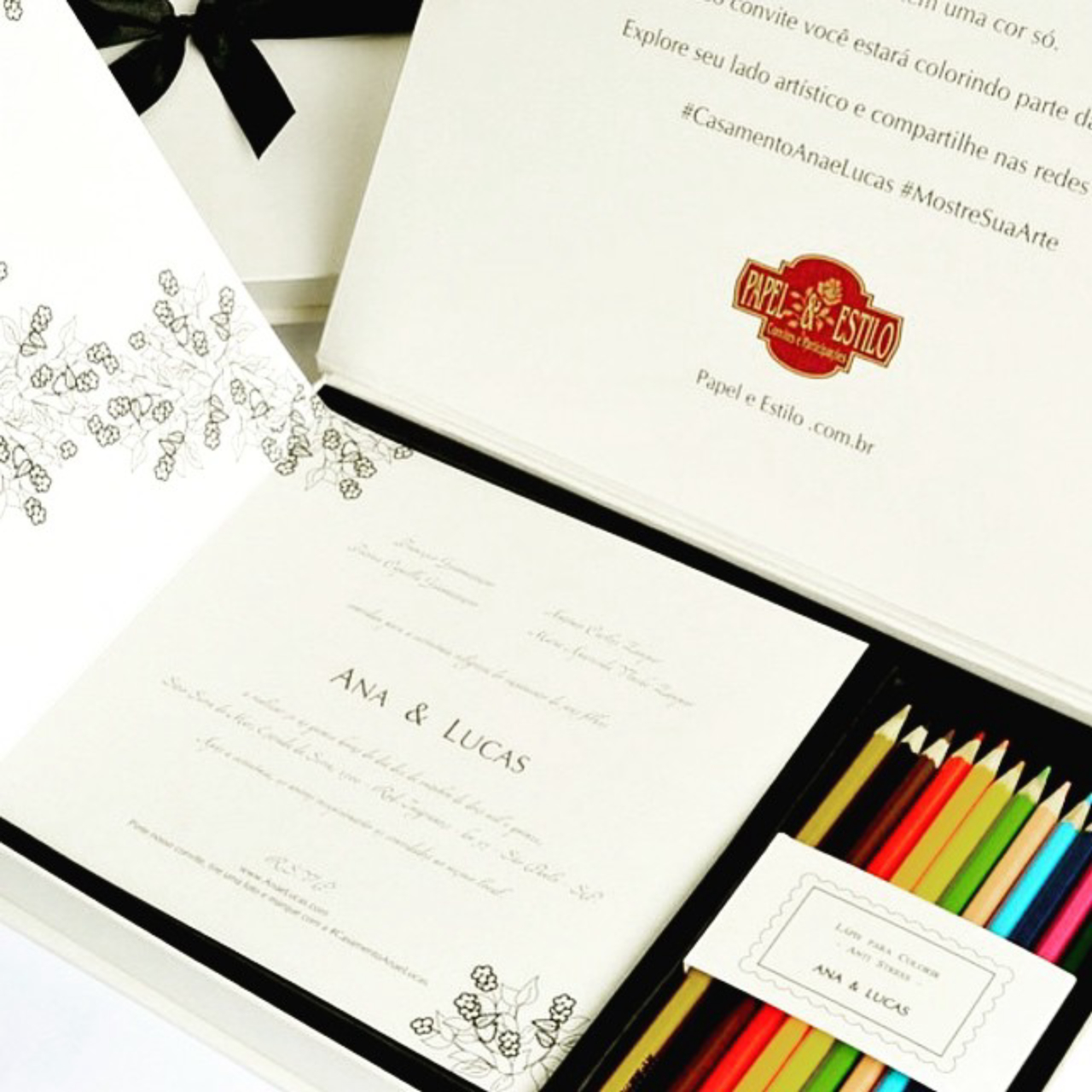 Quem embarcou na onda dos livros para colorir vai gostar desta novidade. O convite para colorir, desenvolvido para os padrinhos, tem ilustrações e uma caixa de lápis de cor com 12 tonalidades.
