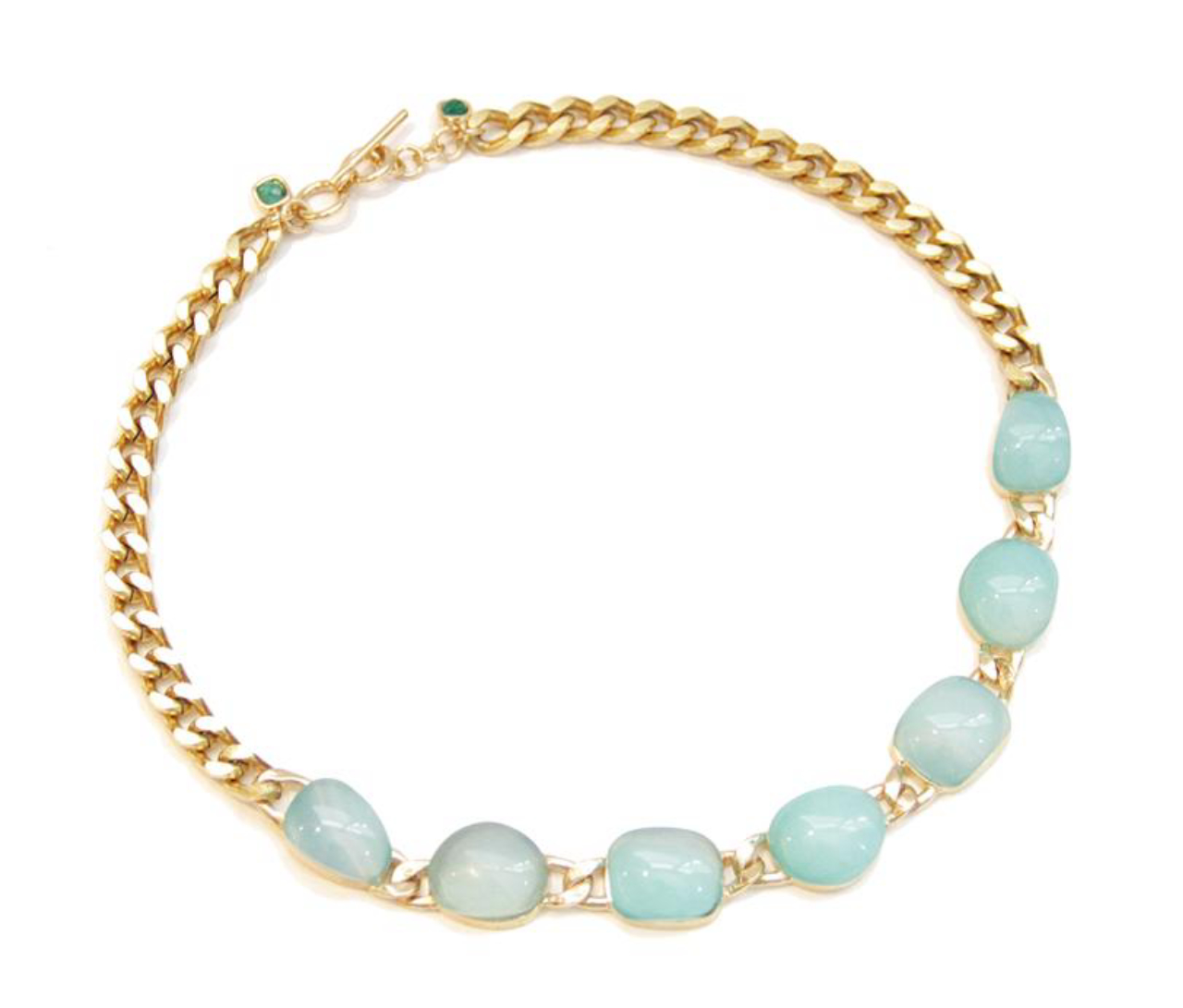 O colar tem corrente em estilo Cartier e o fecho T com detalhes de pedra natural. Na Francesca Romana Diana, R$ 710.