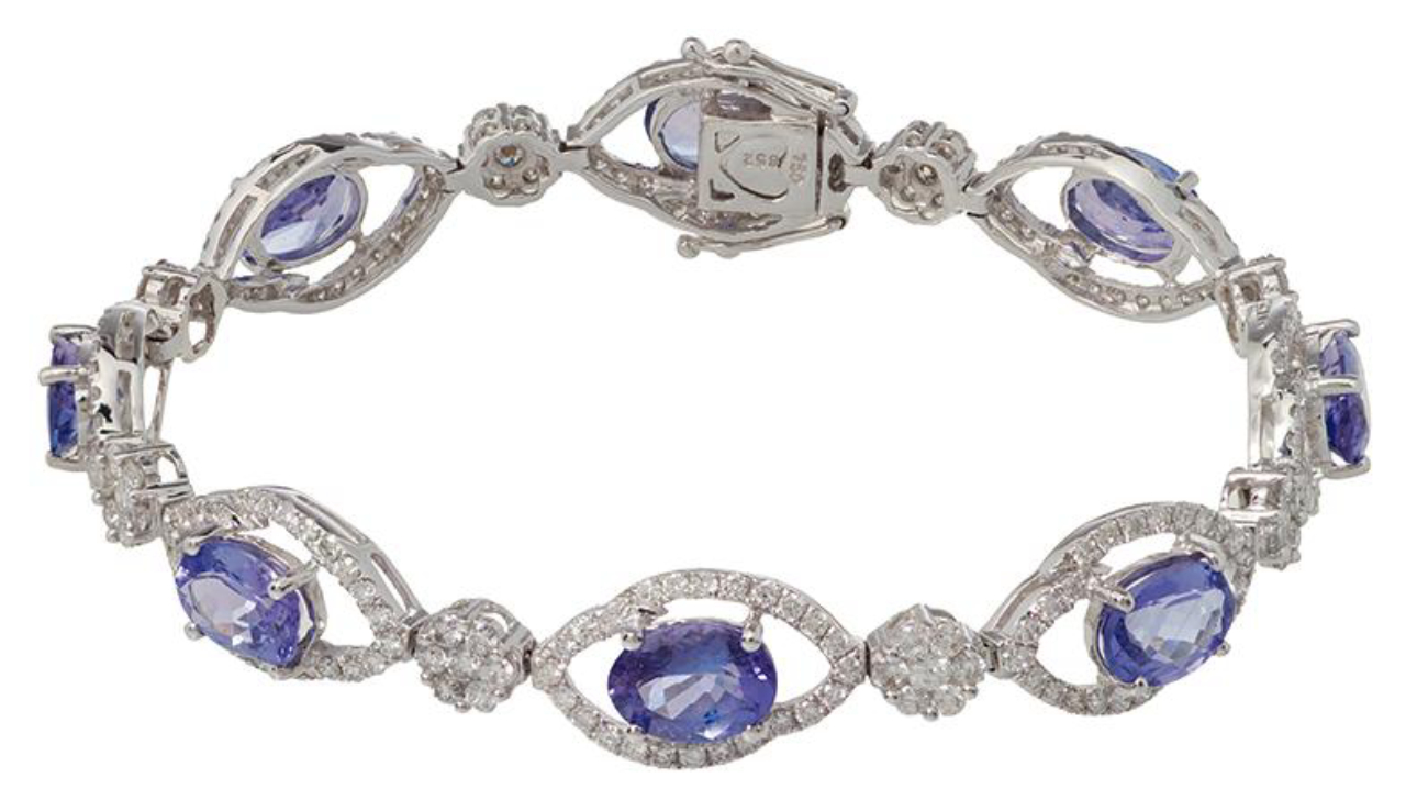 Pulseira em ouro branco com diamante e tanzanitas. Na Renê Joias, preço sob consulta.