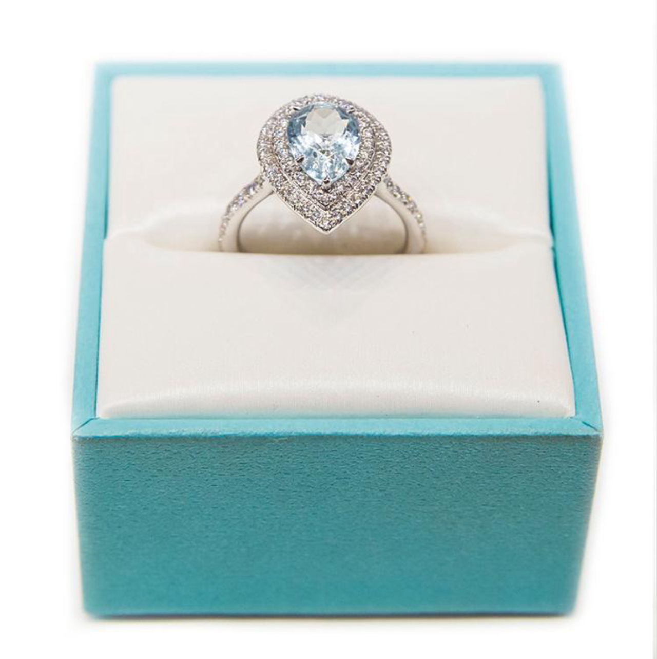 Anel Soleste de água marinha (anel em platina com diamantes e água marinha). Na Tiffany, valor sob consulta.