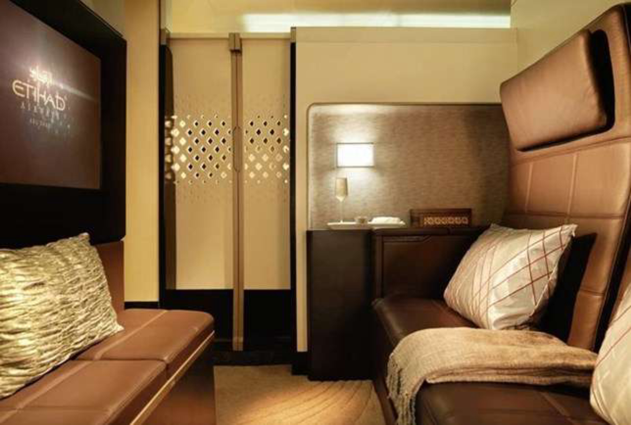 A primeira classe da empresa dos Emirados Árabes Unidos oferece um espaço privativo com cama, acesso a chuveiros e lounge exclusivo no aeroporto