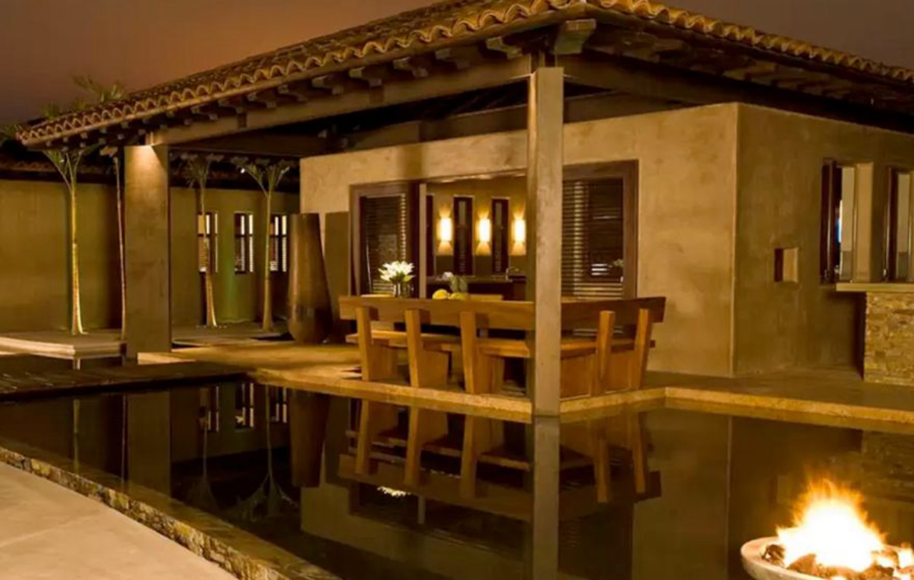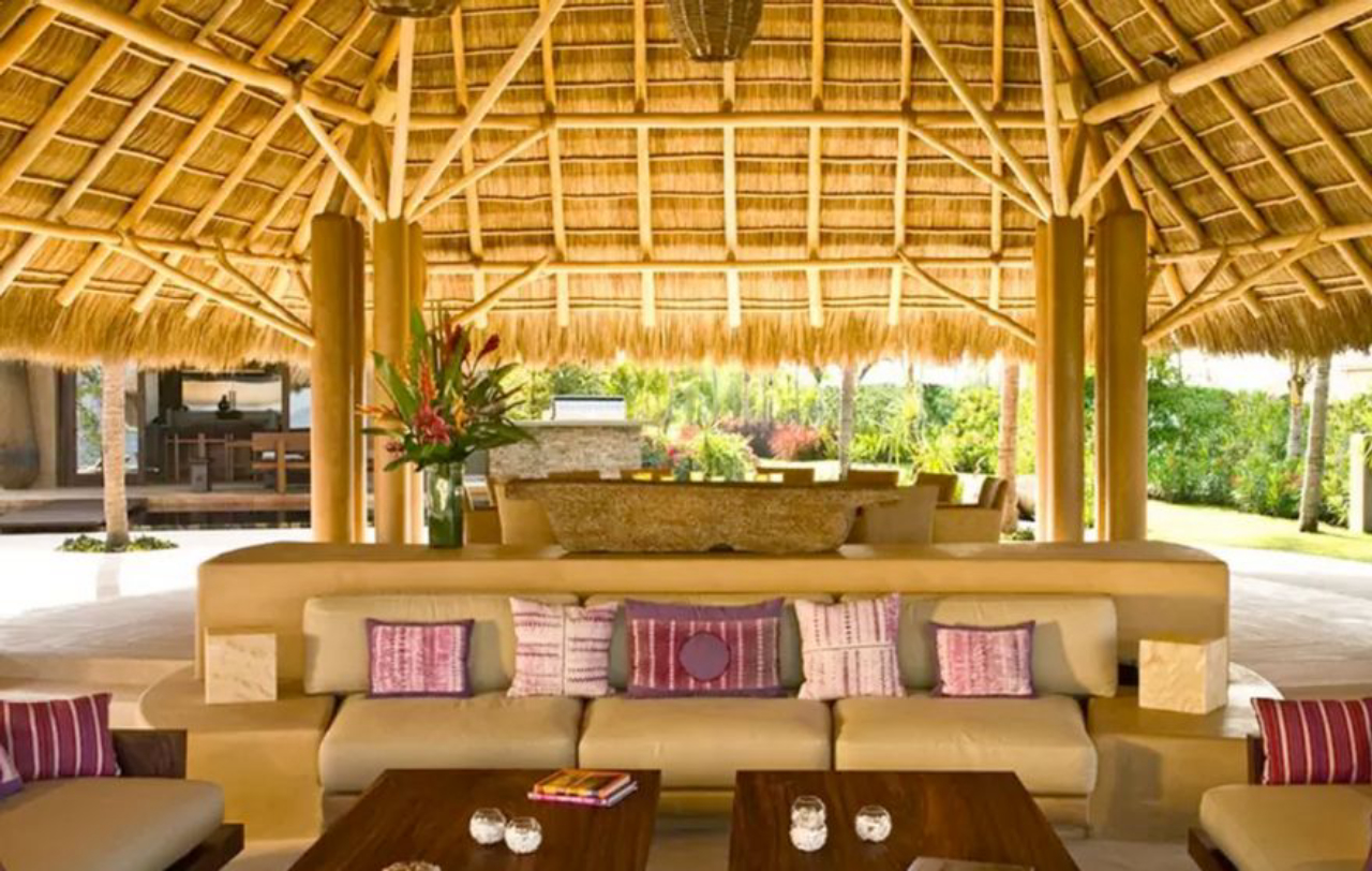 A residência é feita com madeira e pedra, em que se destacam duas piscinas de borda infinita.Lounge externo com decoração hippie chique.Os amplos e sofisticados ambientes internos da residência de praia.