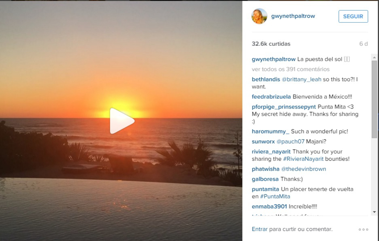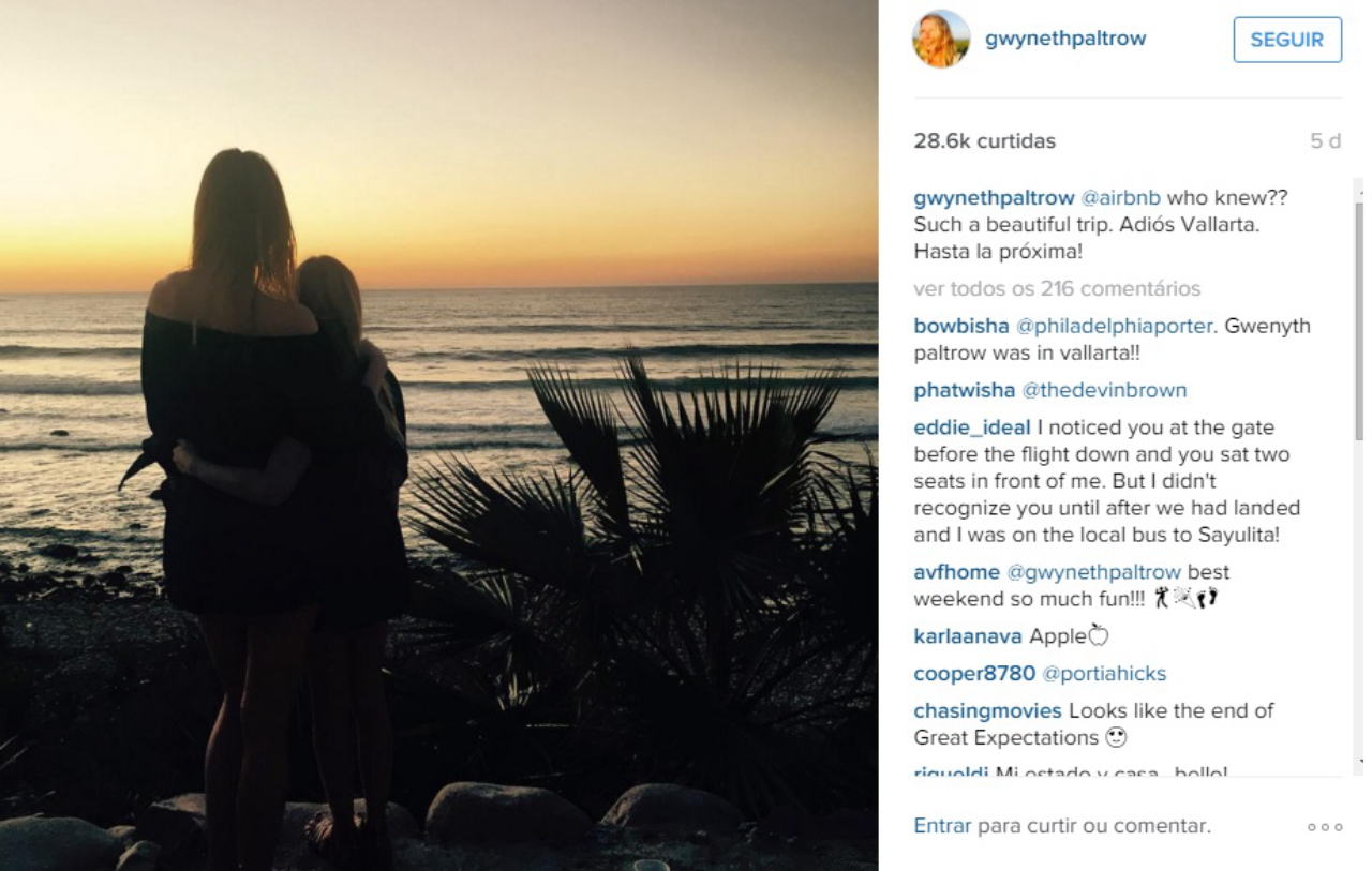 ">Na semana passada, a estrela Gwyneth Paltrow fez duas postagens em seu Instagram. Primeiro foi um vídeo de um pôr-do-sol com o título “La puesta del sol”. Logo depois, uma foto em que a atriz aparecia com a filha olhando para um por do sol e o seguinte texto: “@airbnb who knew? Such a beautiful trip. Adiós Vallarta. Hasta la próxima!” E, na sequência, o site de celebridades TMZ confirmou: a estrela de Hollywood alugou no Airbnb, em janeiro, uma casa de praia (clique para conhecer), no badalado balneário de Riviera Nayarit, na península de Punta Mita, próximo a Puerto Vallarta, no México.