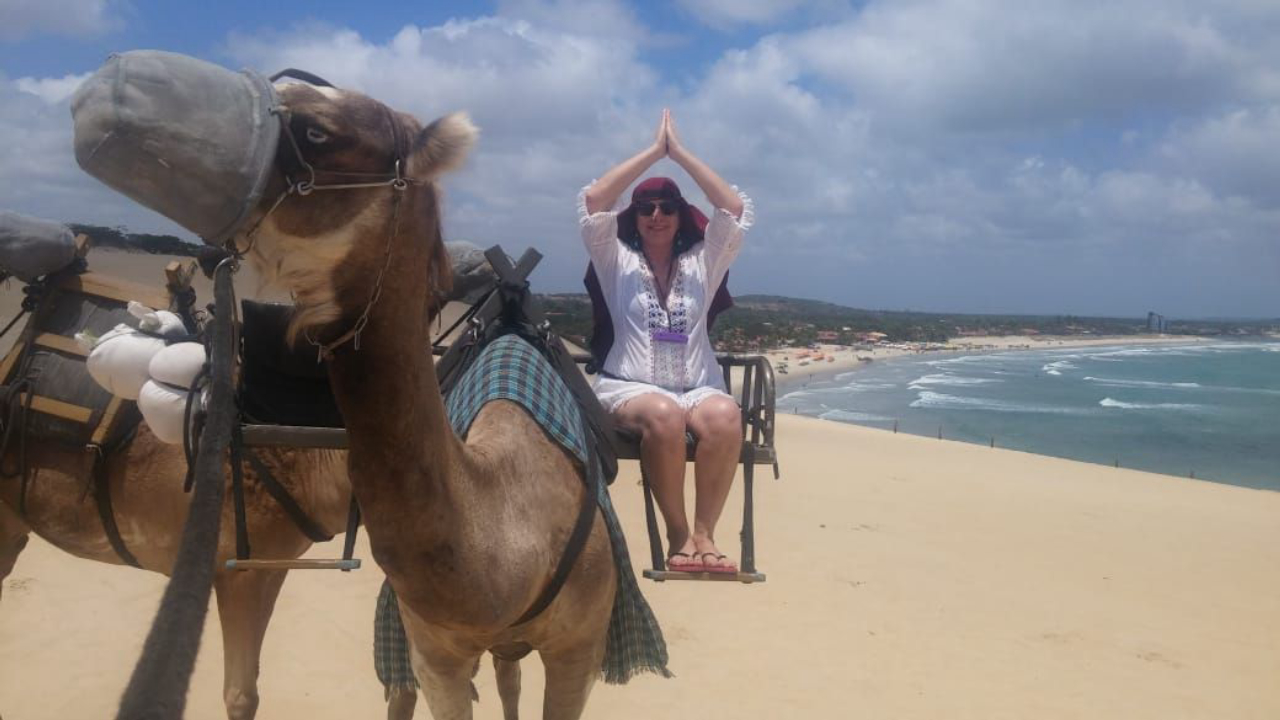 Sem medo, Ivanilde se aventurou no dromedário. Foto: Ivanilde Trevisan/acervo pessoal.