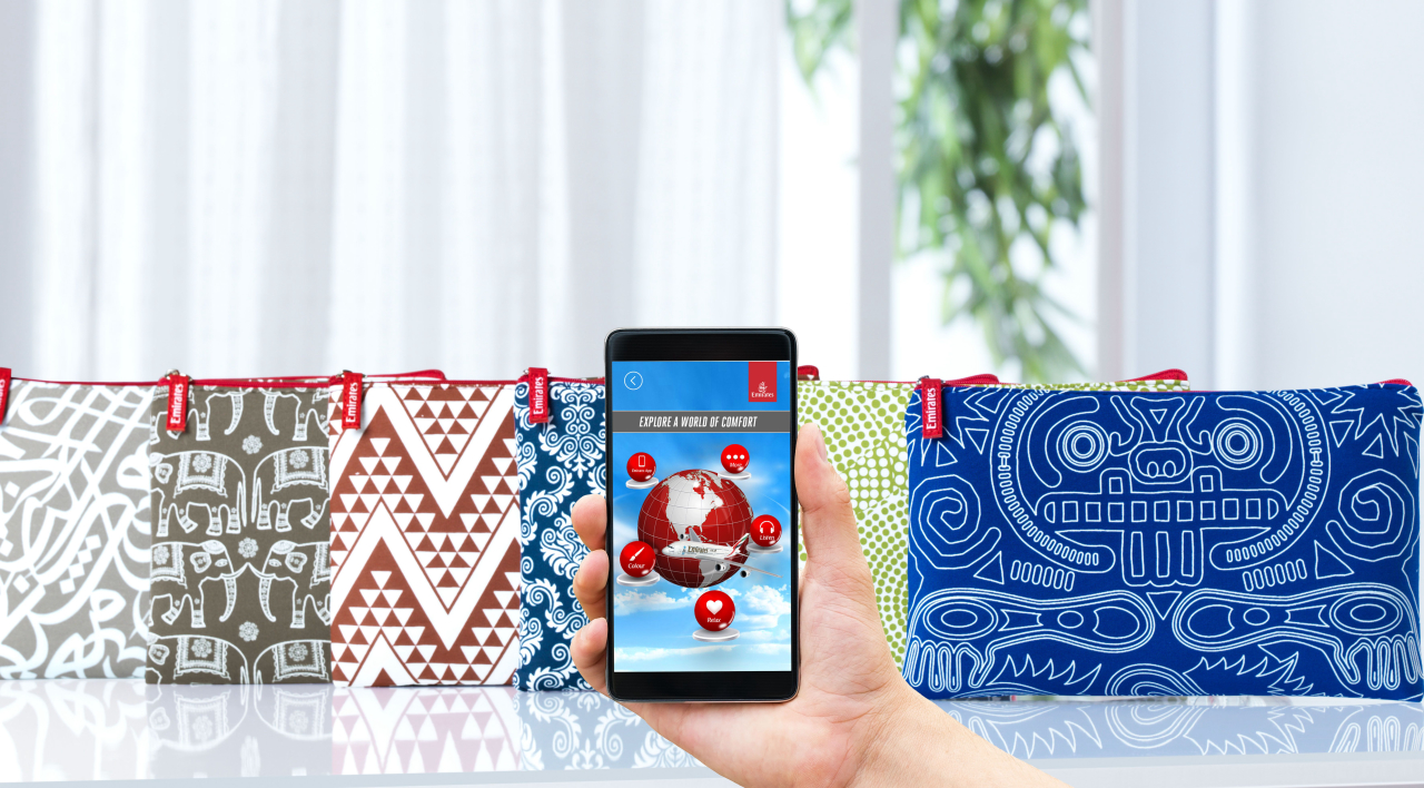 Com o objetivo de manter a liderança quando o assunto é entretenimento a bordo, em 2016 a Emirates lança o primeiro amenity kitinterativo do mundo na classe econômica. Os novos kits utilizam a tecnologia de Realidade Aumentada (Augmented Reality, AR) para disponibilizar conteúdo em dispositivos móveis. As bolsas dos kits contam com estampas que incorporam as cores e os padrões de seis regiões do globo (Austrália/Ásia, América Latina, Oriente Médio, África, Europa e Extremo Oriente), e o design da peça do Oriente Médio, em particular, apresenta caligrafia árabe desenvolvida pelo artista Tagelsir Hassan, dos Emirados Árabes Unidos.