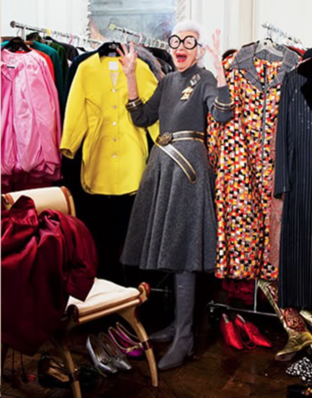 Seu apartamento em Manhattan, localizado na Park Avenue é o seu retrato fiel. A mistura de requintadas cadeiras francesas, caixas pintadas genovesas, xales paisley antigos, santos mexicanos, e muitos outros itens adquiridos por Apfel e seu marido Carl nas inúmeras viagens, funciona de modo admirável.