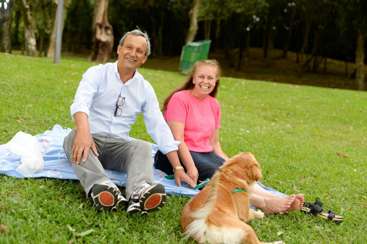 Mesmo com o vento batendo forte, e as árvores dando sinais de que uma chuva estava por vir, o casal Doroti Costa e Luiz Carlos Costa estava apenas começando a tarde no São Lourenço. Na companhia da Fofa, (uma “Golden Retriever 70%”, diz Luiz, que reforça a origem vira-lata do animal), eles esticaram uma toalha de mesa sob a grama, e aproveitavam para ver os patos que mergulhavam no lago em frente.