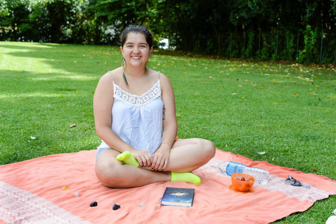 Com a mesma espontaneidade veio a atriz Karol Merencio , de 21 anos, ao parcão nos fundos do Museu Oscar Niemeyer (MON, para os mais chegados). Sozinha, a menina esticou a toalha e dispôs sobre ela tudo que precisava para uma tarde agradável: um pote de morangos prontos para virarem lanche, uma garrafa de 1,5 L de água – “tenho muita sede”, justifica – e um livro quase ao final.