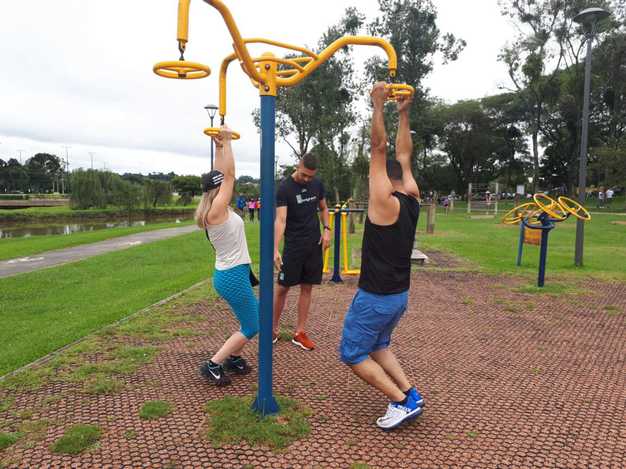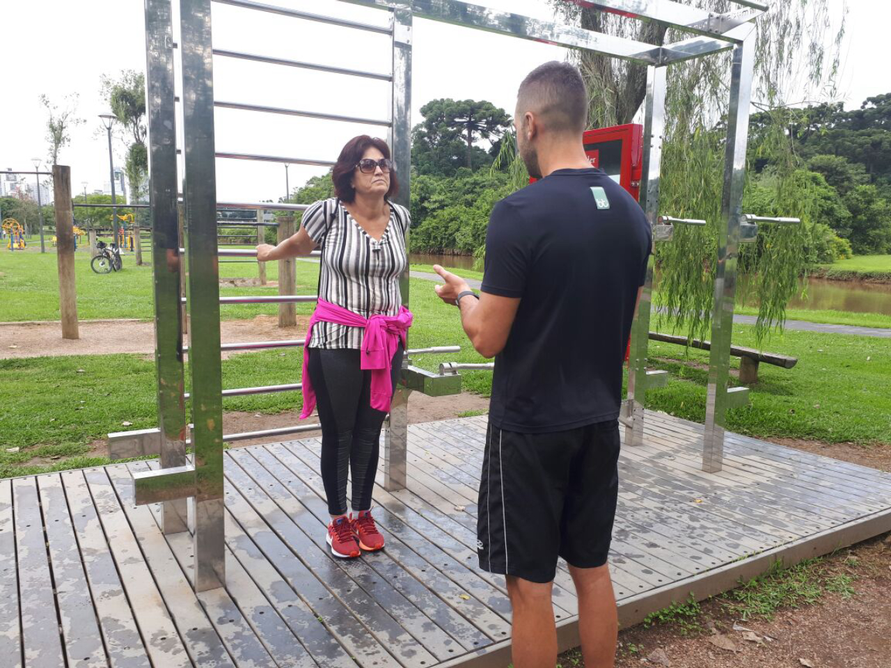 Adriano e Daniela Cimbaluk moram perto do parque Barigui e sempre que podem vão até a pista de caminhada para agitar o corpo. Nesse domingo, eles chegaram à metade do caminho e pararam na academia voltada à terceira idade para dar uma esticada na coluna – posição que André viu de longe e foi rápido orientar. “Como esses aparelhos são voltados aos idosos, a intensidade não é tão forte. Nada impede que você pare um exercício e use os aparelhos, mas se o objetivo é alongar, dar amplitude de movimento, é preciso algo mais focado nisso”, explica o personal.