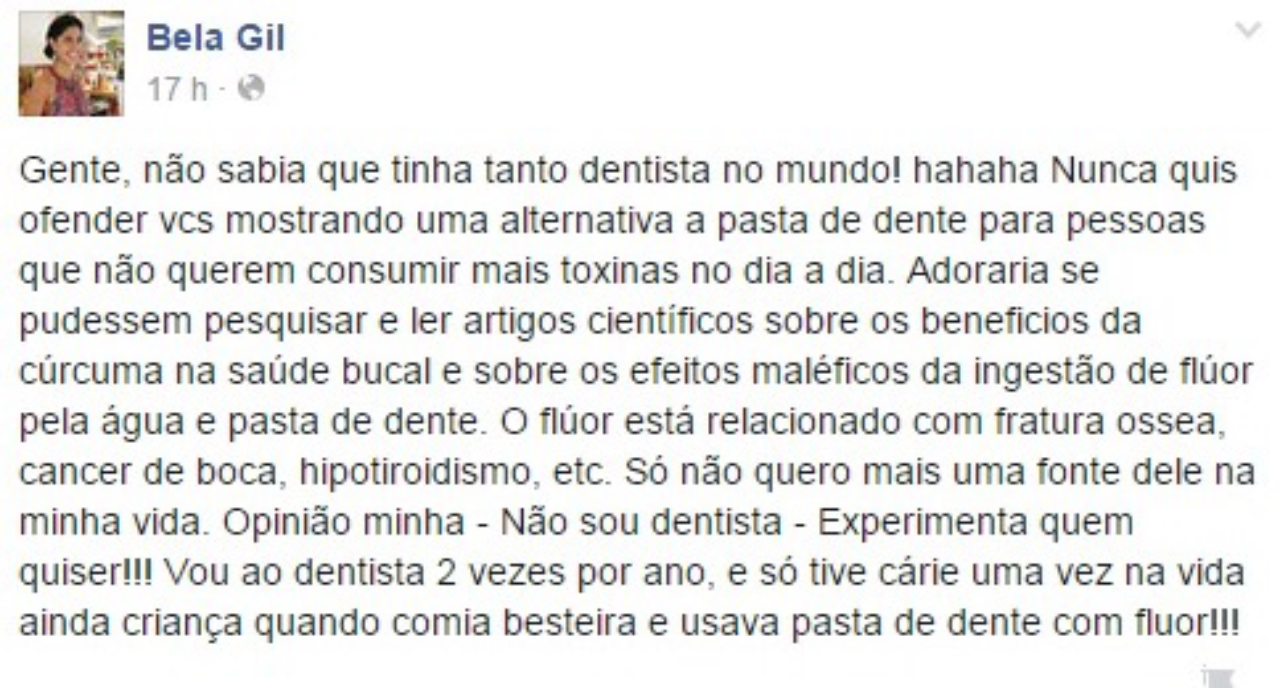 No Facebook, Adriela Mariath, que segundo as informações de seu perfil é professora adjunta de Odontopediatria na Universidade Federal do Rio Grande do Sul (UFRGS), argumentou que o flúor da pasta de dentes é cientificamente provado como o maior responsável pelo controle da cárie no mundo: